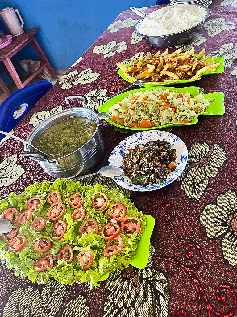 That’s not all we do like the locals; we eat like them too. A keen snacker, when I walk into villages, I find the local kiosk and buy up its entire supply of Beng Bengs (chocolate and caramel wafers with crispy rice wrapped in chocolate) to eat and share. Our main meals, as well, are supplied by the villagers: We arrive in town, settle in and are soon sitting at a large table laid out with bean broths with meaty chunks, bottomless rice, and on a few days, enough instant noodles to feed us many times over. Each stop has a different version of ai manas (sour and spicy chilli sauce), and I love loading a few delicious spoons of the spicy stuff onto my plate and then enjoying its mouth-exploding effect.