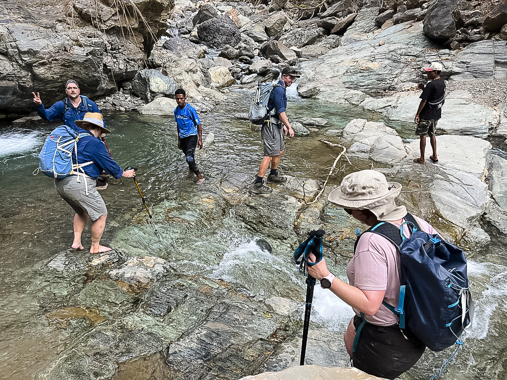 Our packs get tied onto the Troopy (you can carry your own pack, but I figure the hike will be hard enough) and we begin, with 12km to walk on our first day. Starting above 800m asl, we head down narrow trails to below 400m to our first river crossing, where we keep our feet dry by jumping from one large boulder to the next. We zip up from the river abruptly, scrambling at points, with shale splitting away from the contact with our feet, causing me to slip and slide. I grab onto branches and regularly need to abandon my hiking poles to get a better grip. The terrain levels out, and we have lunch in another family home, then climb back up to the 800m we started at and hit 1,300m. I’m feeling satisfied to put to bed a great day of hiking. Up high in Timor-Leste’s interior, it’s cool enough to be comfortable.