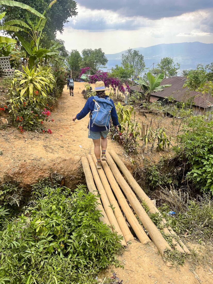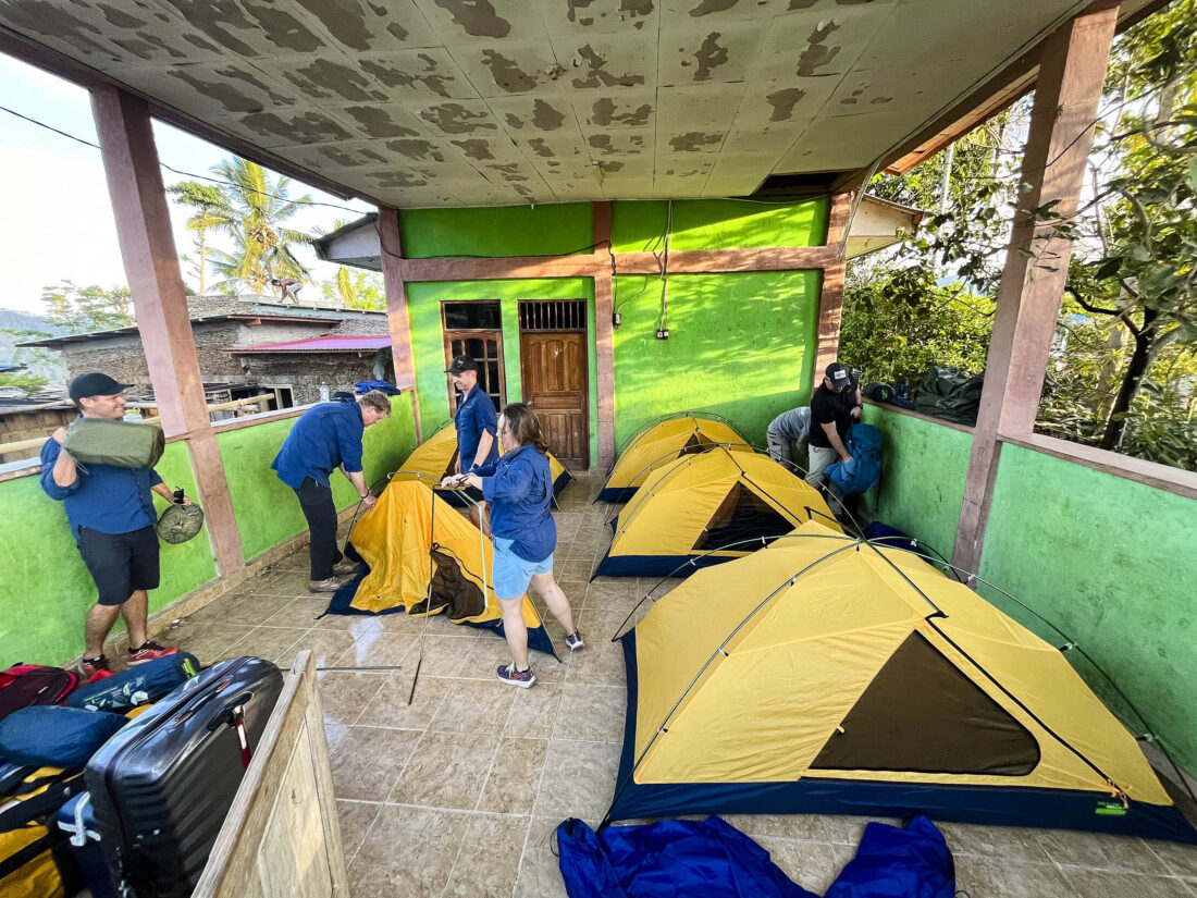 On the night before the trek commences, I’m getting school camp vibes as we blow up our mattresses and chuck them inside our tents. We’re sleeping in a tiled, sheltered patio of a small central building in the village, and locals are going about their usual business around us: drying coffee on tarps, heading out to feed goats. The older women chat and chew betel nut, smiling when we catch their gaze. The kids and local dogs are curious.