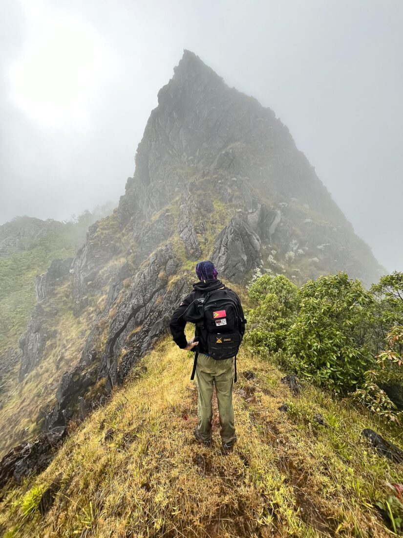 We ascend tracks until we’re in the cool clouds, just able to make out the mountains around us. It is raining but we march on, slipping on and climbing around large, sharp, dark-grey, limestone outcrops while we follow the disappearing trail, which at points seems to veer off up impassable peaks. Suddenly, our path meets up with the main trail heading up (or down) Tatamailau, but we arrive here hours later than expected. The choice is ours: Head downhill, without summiting; or hike up for about 45 minutes, then descend for about an hour and a half in the dark.