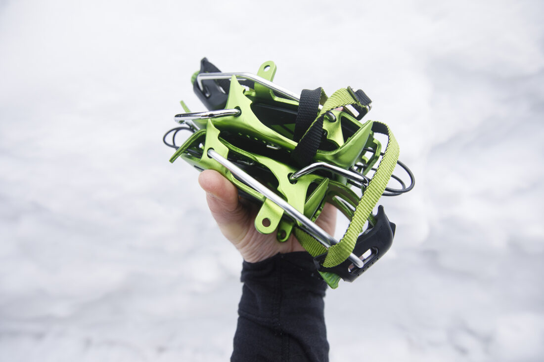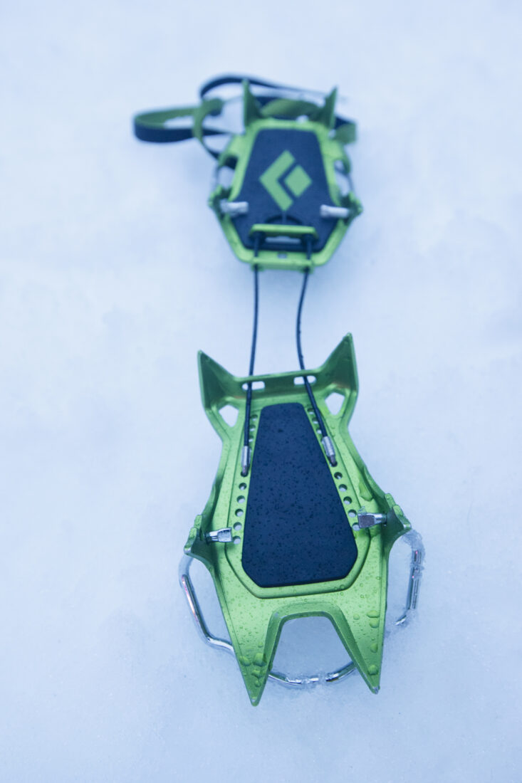 They were quick to get on and off, too, and the attachment system was intuitive and easy. The toe bail is nice and wide, so it accommodates ski boots. And they come stock with anti-ball plates; if you’ve ever had a ball of sticky spring snow weighing what feels like a kilo or more stuck to your crampons, you’ll know why this is important.