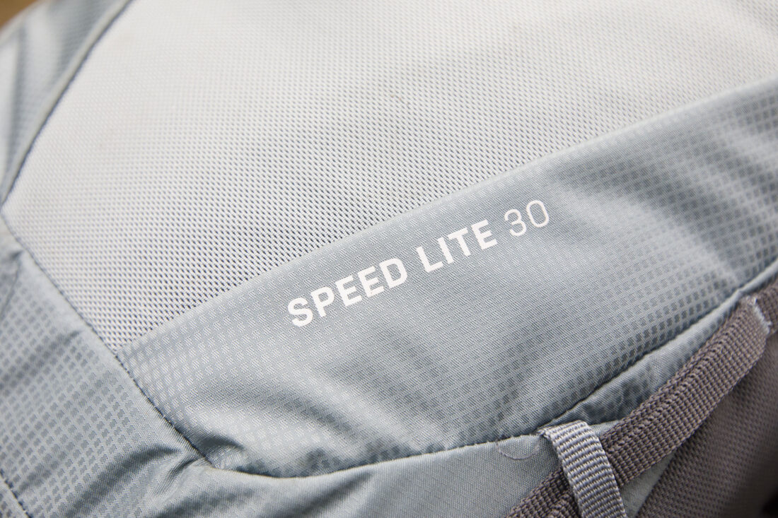 But perhaps I shouldn’t dwell on this innovative aspect of the harness too long, because the pack has a load of other features that deserve mentioning. Perforated shoulder straps (ie they have holes all through them) allowing far better breathability; two lid compartments; stretch side pockets; a stretch-mesh back pocket you can store raingear in; attachment loops and straps for trekking/running poles and even ice axes if you’re using the Speed Lite 30 for some light mountaineering; and it has well-placed compression straps to cinch down your load, useful for trail running and/or fastpacking. The pack is perfect for the latter, because the ‘lite’ in its name is not for nothing; it weighs just 878g (as tested) for a 30L pack. There’s a 25L version with the new vest-style harness, along with women’s-specific SL (Slim Line) models (23L and 28L). The pack is entirely PFAS-free, too, and the body fabric is 100% recycled.