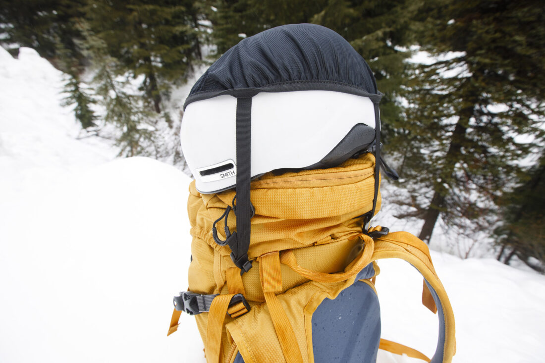 Here are a few more relevant features: It has either A-frame or diagonal ski carrying. Vertical or horizontal snowboard carrying. Massive, glove-friendly zipper toggles. Sled-carry attachment loops. Dual-position helmet carry. An adjustable strap for easy under-the-lid rope carrying. Ice- axe loops and a hip-belt gear loop. This is a feature-heavy pack.