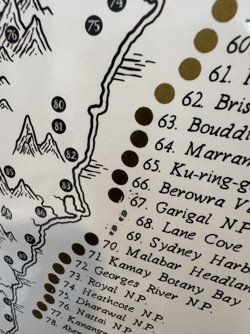 The best bit though comes with the “scratch” component of the maps.  Checklists are one thing, but the these maps bring you that old school “scratchie” experience of rubbing off the dot for each park or trail you’ve completed.  As I went to get started scratching off Sydney Harbour  N.P. as my first one, I found myself yelling out to the Adventure Entertainment office “does anyone have a coin?”.  Would you believe it – no!  It seems coins aren’t such a common thing anymore – fortunately the scratch effect works just as well with a key or bottle opener.