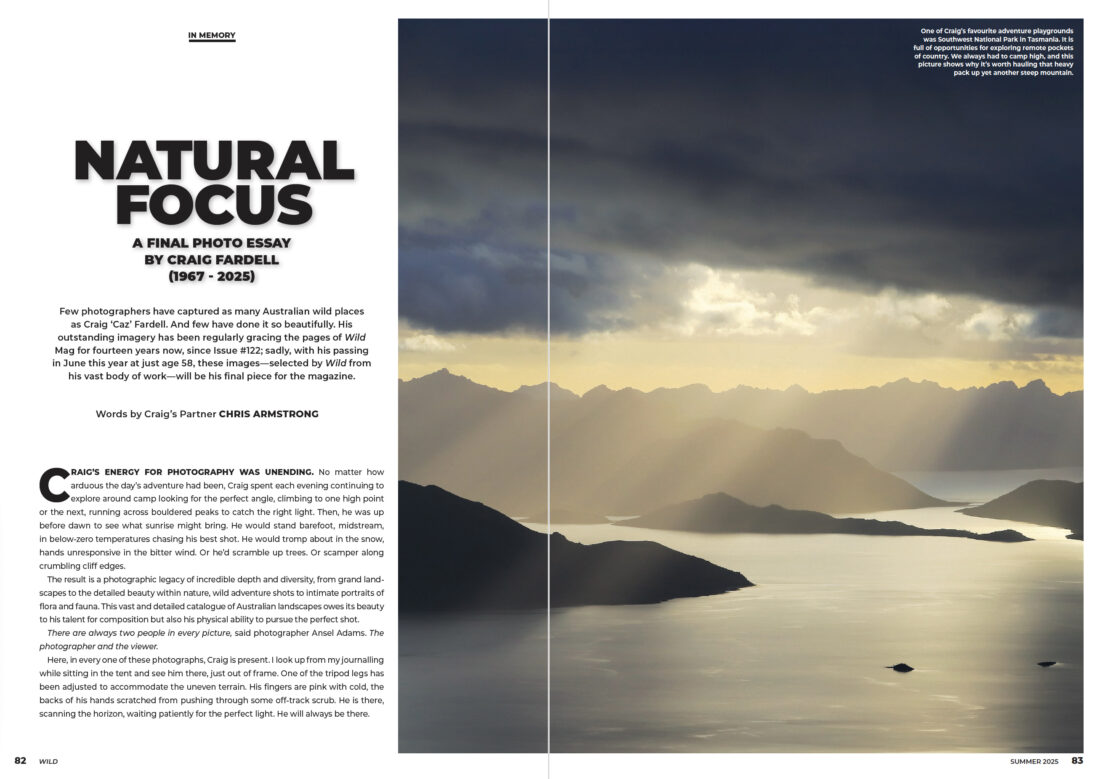 Few photographers have captured as many Australian’ wild places as Craig ‘Caz’ Fardell. And few have done it so beautifully. His outstanding imagery has been regularly gracing the pages of Wild Mag for fourteen years now, since Issue #122; sadly, with his passing in June this year at just age 58, these images—selected by Wild from his vast body of work—will be his final piece for the magazine.