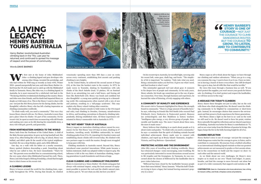Henry Barber revolutionised Australian climbing back in the ‘70s. Last year he returned, and continued to spread his message of respect and the power of community.