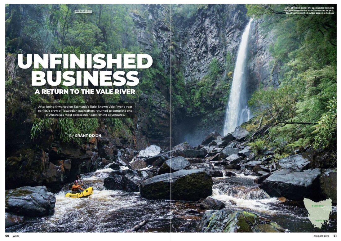After being thwarted on Tasmania’s little-known Vale River a year earlier, a crew of Taswegian packrafters returned to complete one of Australia’s most spectacular packrafting adventures.
