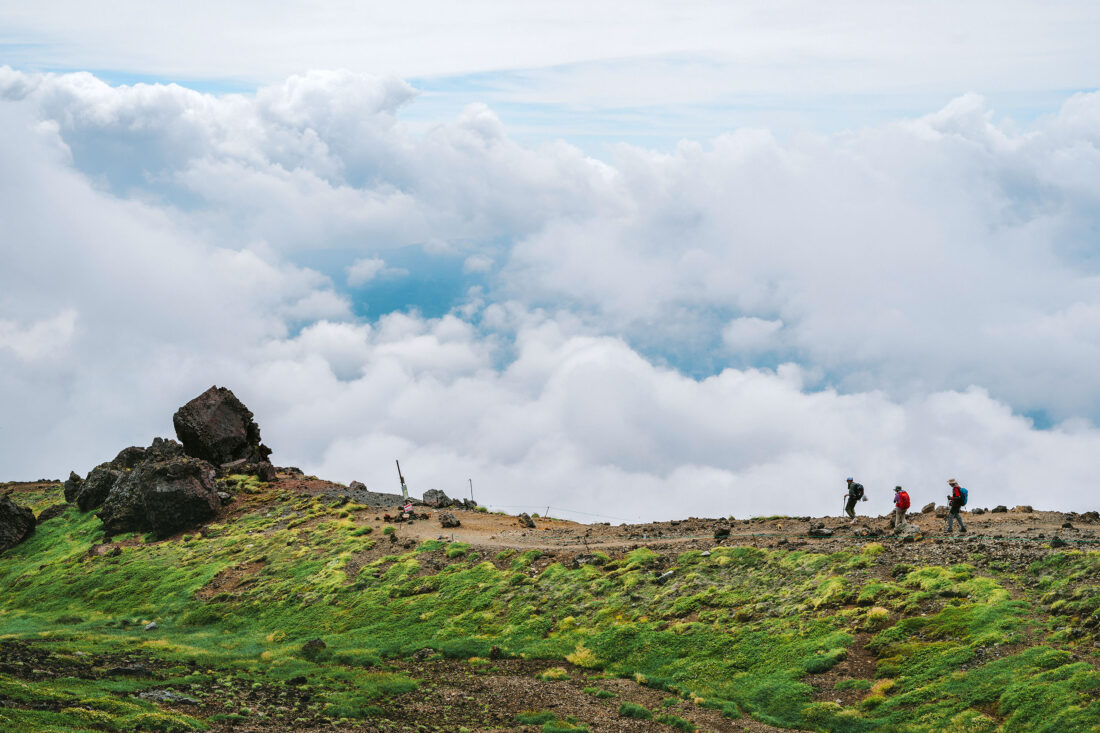 Here the mountain showed its character. Steam puffed from vents; slopes were streaked red, yellow, and grey; and craters were carved into its flanks. At over 2,000 metres, the summit was wreathed in cloud, but that only deepened the sense of mystery. We paused and ate onigiri, a simple but perfect hiking lunch, and watched the wind carry sulphur-filled mist across the ridgeline.